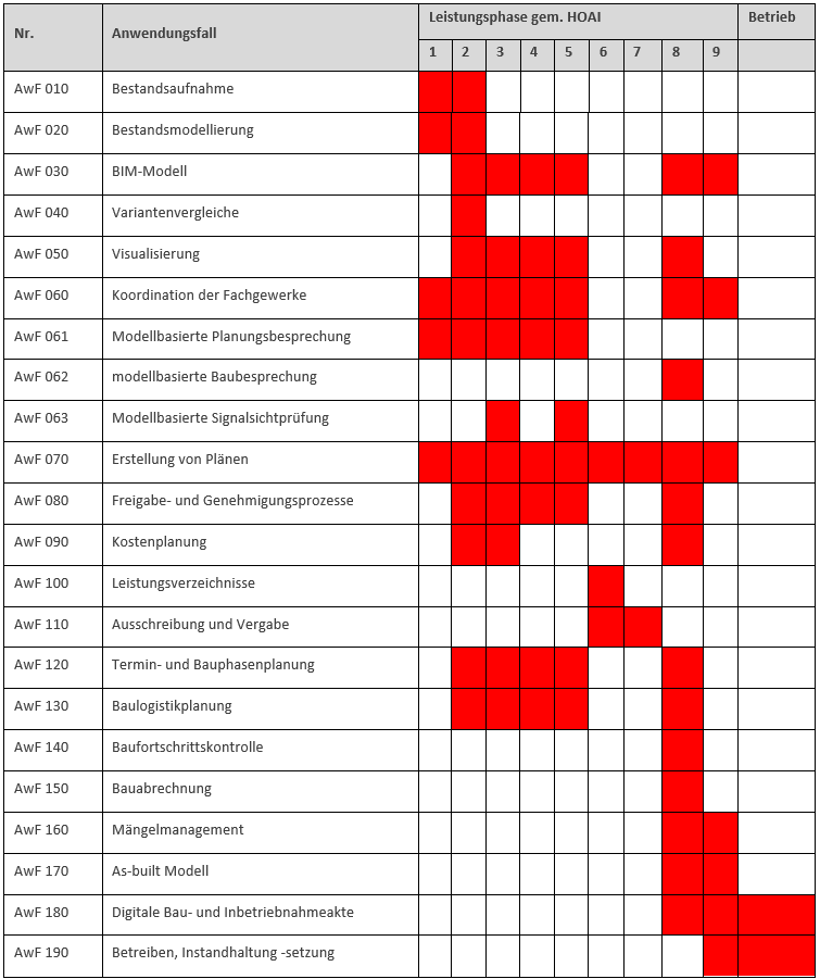 Die DB InfraGO AG hat für den Geschäftsbereich Fahrweg insgesamt 19 Anwendungsfälle für die BIM-Methodik definiert. Die Anwendungsfälle wurden zunächst für die Planungsphase auf Grundlage der BIM-Pilotierung erarbeitet. Im Rahmen vom Testprogramm BIM2Build erfolgt die Detaillierung der AwF für die die Ausführungsphase. Der AwF 19 stellt dient dem späteren Betreiben der Anlagen, wofür die erforderlichen BIM-Standards noch erarbeitet werden.